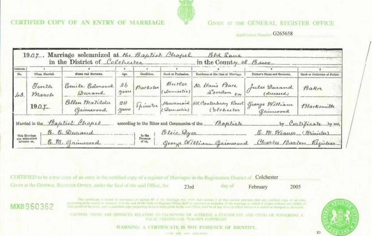 Source: Marriage Certificate 1907 (DURAND, Emile Edmond & GRIMWOOD, Ellen Matilda)